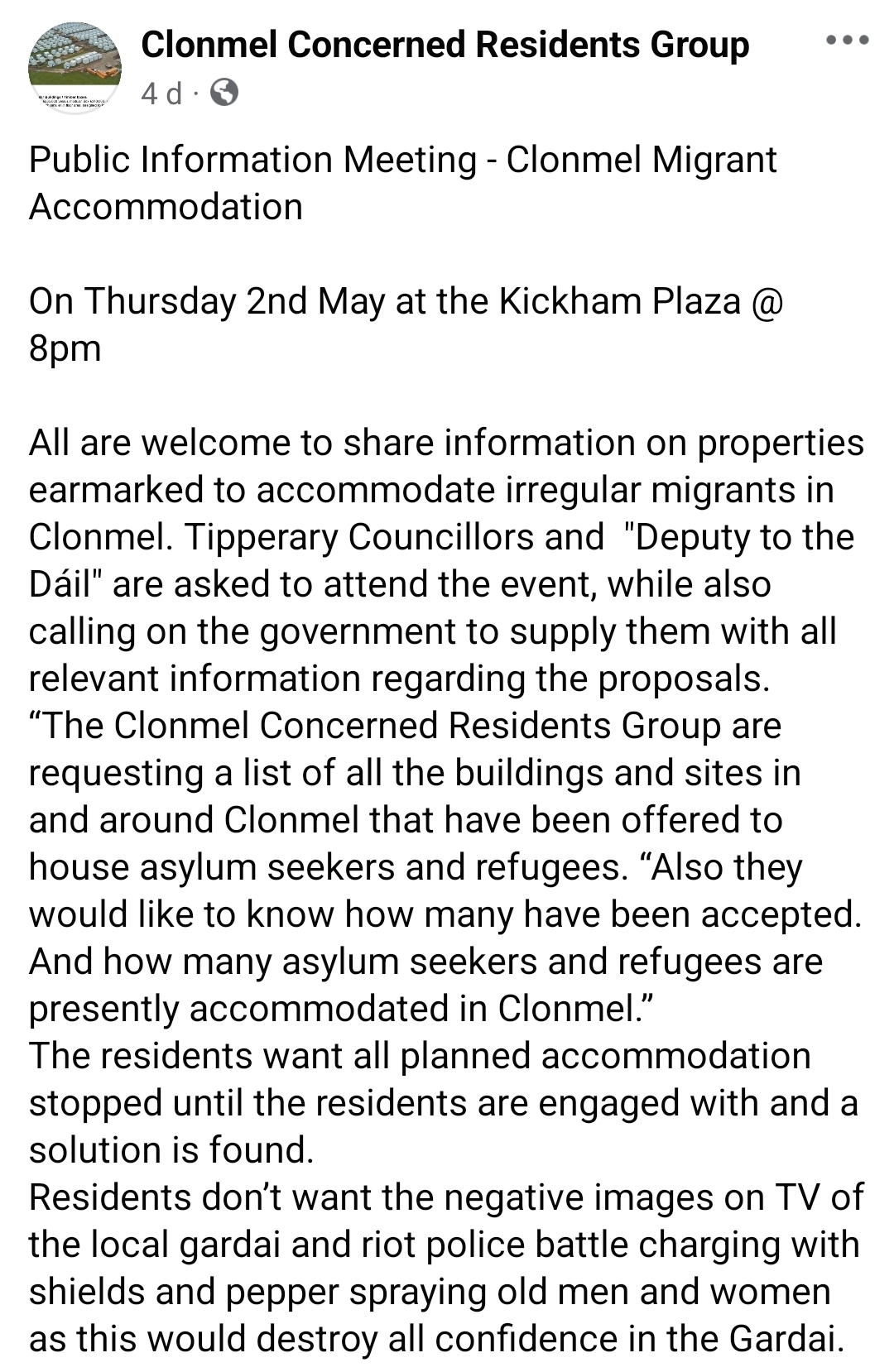 I hope this suffices as a summary of my investigation, findings and evidence for the people in my community the CCRG are attempting to deceive, and that you will join me in shutting the door in their face should they come knocking. However, I want to bring up just one more of the many interesting things I found while researching this piece. As far as I can tell, even the very first public meeting in this campaign, on the 20th of April, was instigated not by any concerned resident of Clonmel, but by… David Moloney. All the way back on the 17th of April in the comments section of a Tipp FM Facebook post soliciting opinions on the announced plan for the modular homes, David Moloney posted a date, time and location for his planned protest, saying “I am looking for help in organising this, I would like to see it started and for locals to take over organising it. I think it is important to kick it off”, with an image captioned “TIPPERARY CONCERNED CITIZENS”. Moloney has not insinuated himself into a group of existing concerned residents. The entire campaign has been driven from the very start by a disgruntled racist and conspiracy theorist from another town, and he started his campaign in the comments section of Tipp FM’s own Facebook page, right under their noses. Mattie McGrath spoke at that first meeting, evidently accepting Moloney’s invitation.