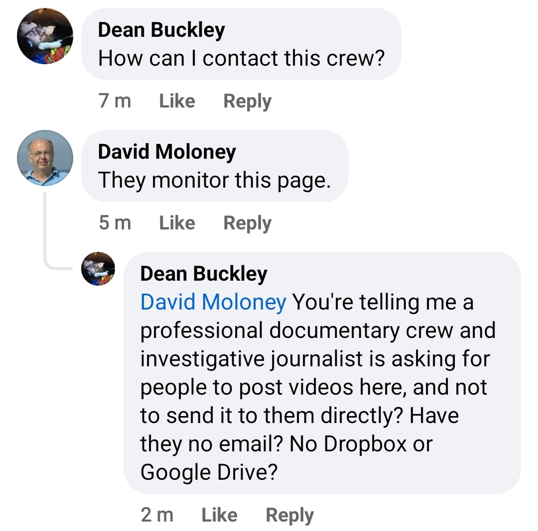 However, I’m far more concerned about David Moloney, who was also interviewed by Fran Curry on Tipp Today the day after Dee Dempsey on the 24th of April. I overlooked this interview early on in my search: at first, I was just trying to figure out who was operating the “Concerned Clonmel Residents Group” page that appeared on Facebook on the 25th of April. It didn’t take long to crack the case, since David Moloney loves to copy and paste his posts over and over on different pages and comments sections, and the CCRG Facebook page reused some of his posts, including what seem to be bespoke racist memes of Moloney’s own creation. I also very quickly found his Twitter by searching phrases from his posts, where he likes to just copy and paste his posts over and over even more, it turns out. But you can’t just know the answer, you have to show your work when making a claim like this, and I didn’t feel confident I could say this page was created by and at least primarily operated by David Moloney, if not exclusively, on this evidence alone. I had to figure out where the CCRG, the actual group of people, however small, came from if I was going to connect Moloney to the page definitively. It turns out I needn’t have bothered. I asked a question on the Clonmel Concerned Residents Group page regarding an alleged British TV crew coming to town, and David forgot to switch accounts before replying to me. He then deleted my comments and limited further comments on the post, only I’d taken a screenshot, clearly, so I messaged to ask if I could take his replies as an admission he was operating the page. I’ve received no response to my question at time of writing, but he has seen the message. I think the answer is pretty clear.