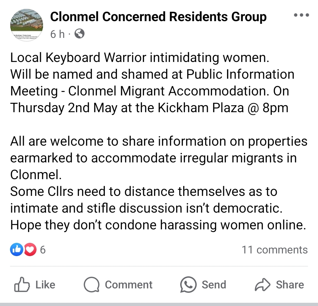I would like to stress again at this point that David Moloney is from Tipperary Town, and has no connection to Clonmel, yet he has appointed himself the grand crusader for the people of the town against the imaginary foreign hordes. He and his bigoted buddies talk about a lack of consultation to cynically exploit real frustration about the Irish government’s general lack of transparency, but they’re not even calling for a consultative process. They want a list of targets, because they don’t give a shit about Clonmel or its people, and they’ll happily brand anyone in Clonmel an enemy of the town if they disagree with the CCRG in any way.