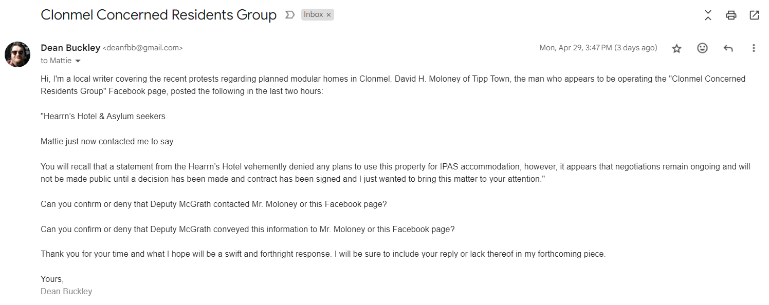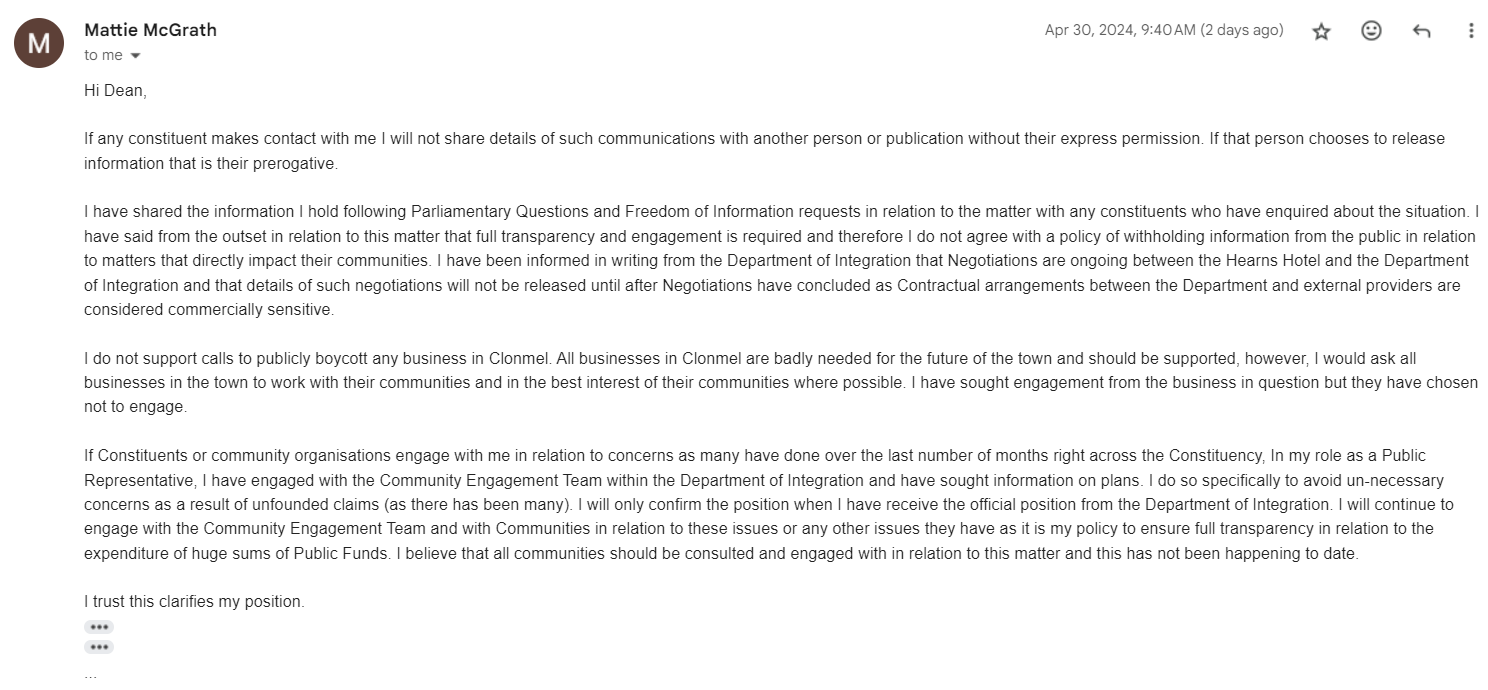 As I said, Mattie McGrath has not yet responded to an email asking him to confirm or deny if he told David Moloney of a secret plan to build a detention centre for asylum seekers in Clonmel. I am not surprised by Mattie’s silence. He was in the Dáil this morning, for one, so he’s a little busy, but also he definitely does not want to answer my question. If he does anyway, I will update this post to include his response. But if I’m not surprised at all by Mattie’s silence, I am gobsmacked that a man claiming to speak for a local activist group told Fran Curry on air that Mattie McGrath told him of a secret plan to build a detention centre for asylum seekers in Clonmel and Tipp FM apparently have absolutely nothing to say about it, no questions to put to Mattie. Since this interview aired, all they’ve posted about either party is another story that was essentially just a press release for the CCRG about their latest protest on the 27th of April and a story about Mattie’s opposition to the EU Migration Pact. I am genuinely stunned that a journalistic outlet could have a story like this drop into their lap, whether Moloney is lying or not, and apparently pass up the chance to look into it at all. I’ve had my issues with Tipp FM and how they cover local news over the years, but this really shook my confidence in them, I have to say.