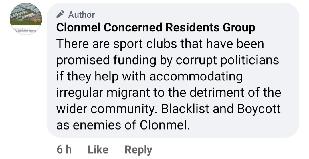 I spent days monitoring the page as it made more and more unhinged posts, claiming that unspecified “local bad actors” were deliberately importing “large numbers of unvetted foreign men” as part of some sinister plot, and even that local sports clubs are being paid off by corrupt politicians in exchange for housing refugees. This is a clear reference to Clonmel Rugby Club, whose grounds are also adjacent to the site, but who don’t get mentioned much by the “concerned residents”, presumably because their chairman said in a public statement that the club has no problem with the development itself, stressing a commitment to inclusivity and diversity, though they are frustrated with the lack of consultation, particularly since they’ve previously made efforts to expand their facilities onto the land and received no response. Moloney reckons this makes them “Enemies of Clonmel” who must be boycotted and blacklisted, along with “all business and individuals that work against Clonmel and disregard residents’ concerns”. Many, maybe most, posts made from this page have since been deleted, as have almost all comments made on the remaining posts. Evidently they got a notion to start cleaning up their image.